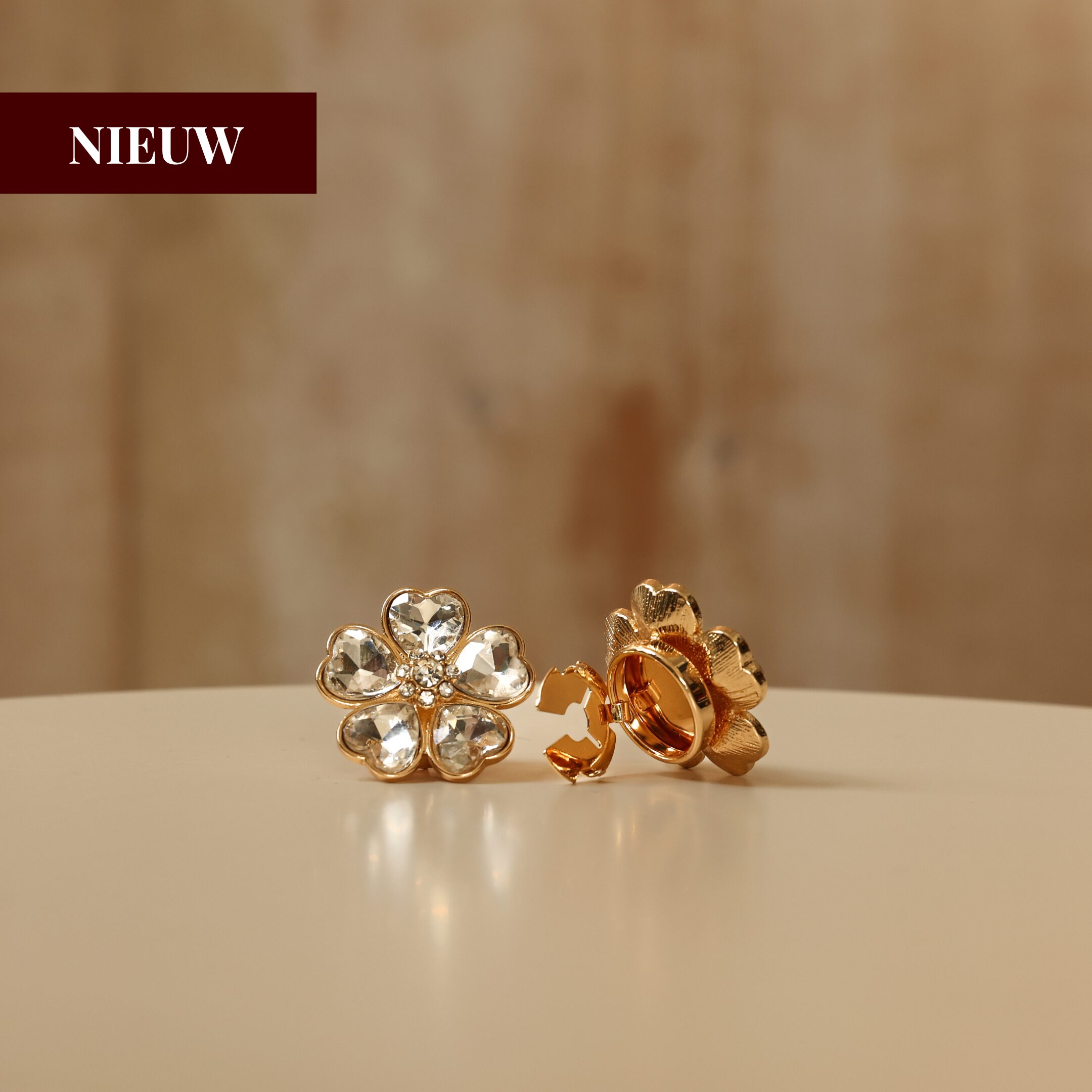 De Re-COVR button covers staan voor luxe, kwaliteit en tijdloze elegantie. Elke button cover is vervaardigd uit hoogwaardig, behandeld koper dat bestand is tegen verkleuring en zijn glans langdurig behoudt. De Loyse button cover kenmerkt zich door een verfijnde bloemvorm met sprankelende stenen en een warme gouden basis. Het ontwerp vangt het licht op een subtiele manier en straalt een frisse, zomerse elegantie uit.